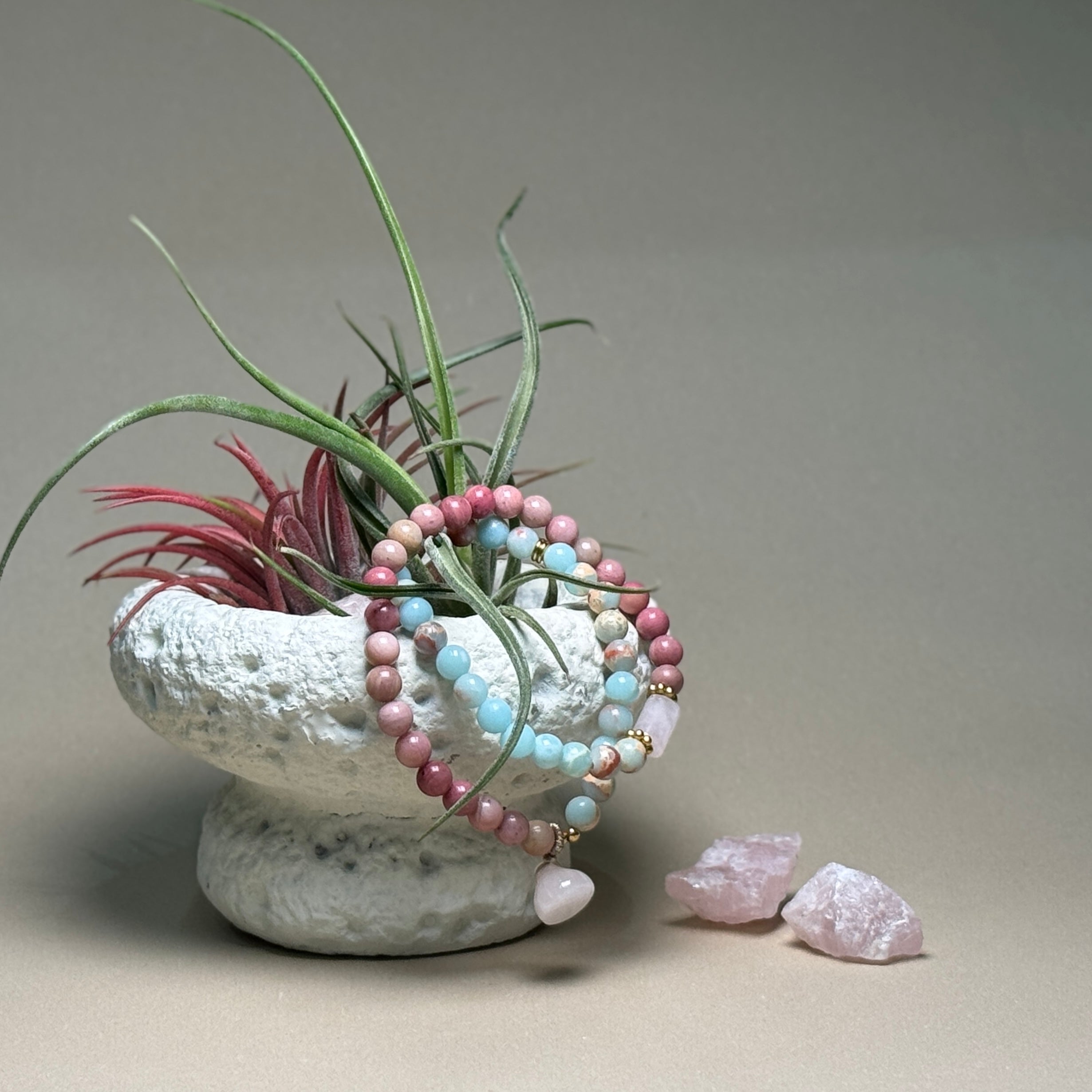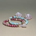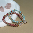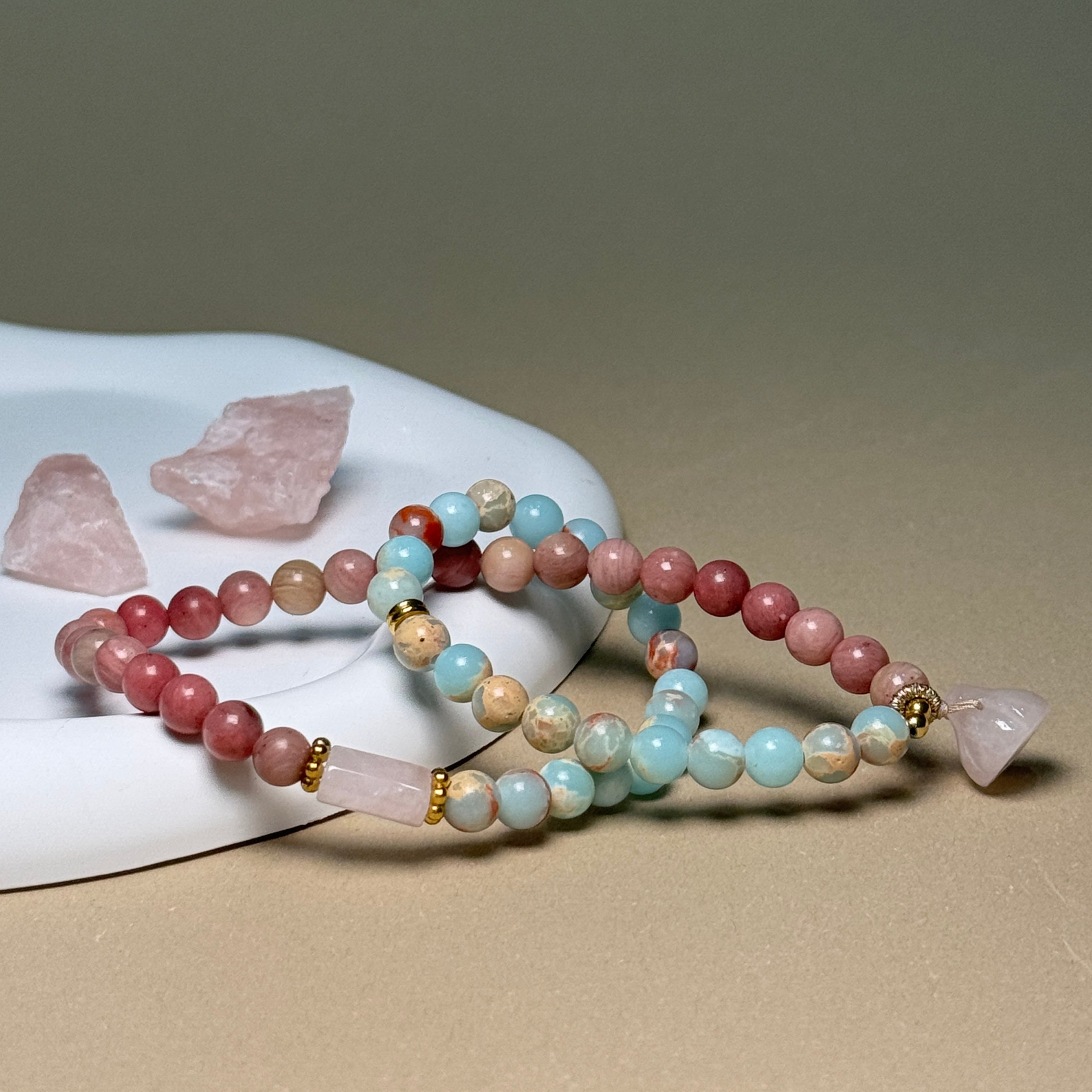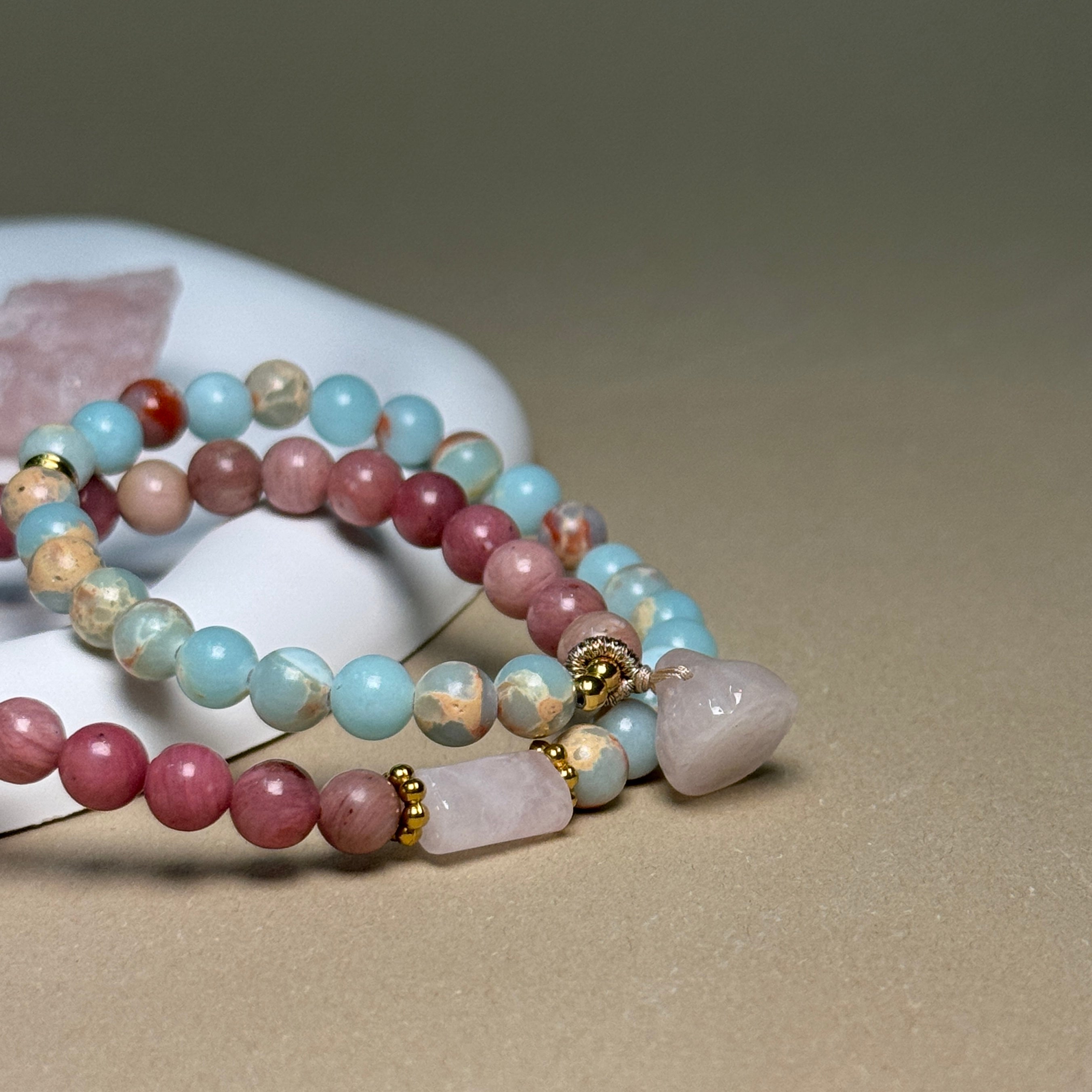 The bracelet combines the soothing pink hues of natural rhodonite and the grounding energy of Shoushan stone, accented by a delicate rose quartz lotus pendant — a timeless symbol of purity, love, and enlightenment. Its double-wrap design represents unity and continuous growth, making it a meaningful piece for daily wear.