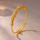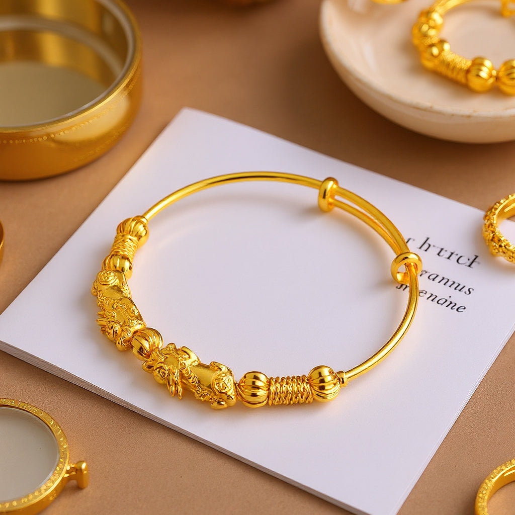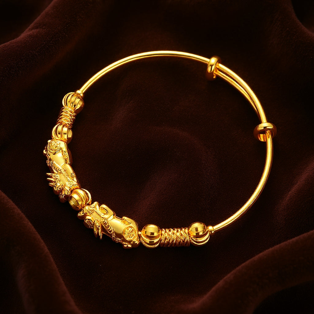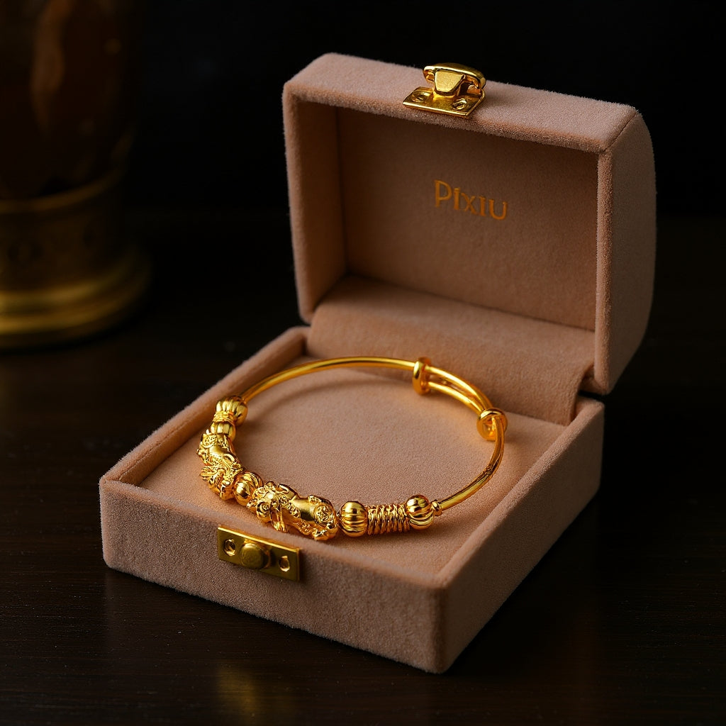 Step into abundance with the radiant charm of the Golden Pixiu Bangle — a timeless talisman believed to attract wealth, safeguard blessings, and energize your personal power.