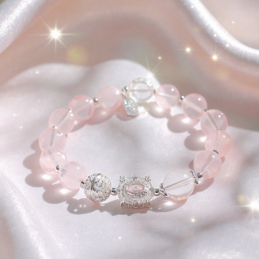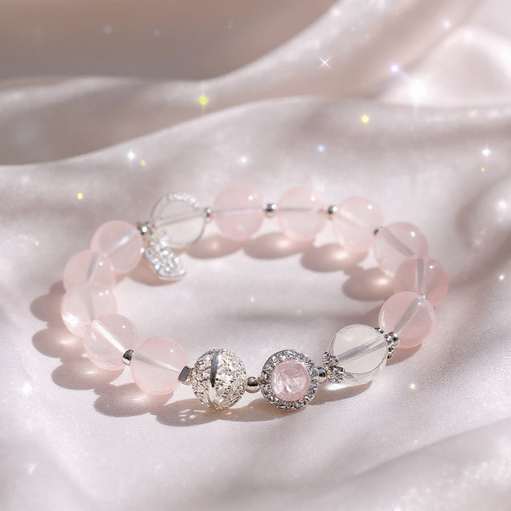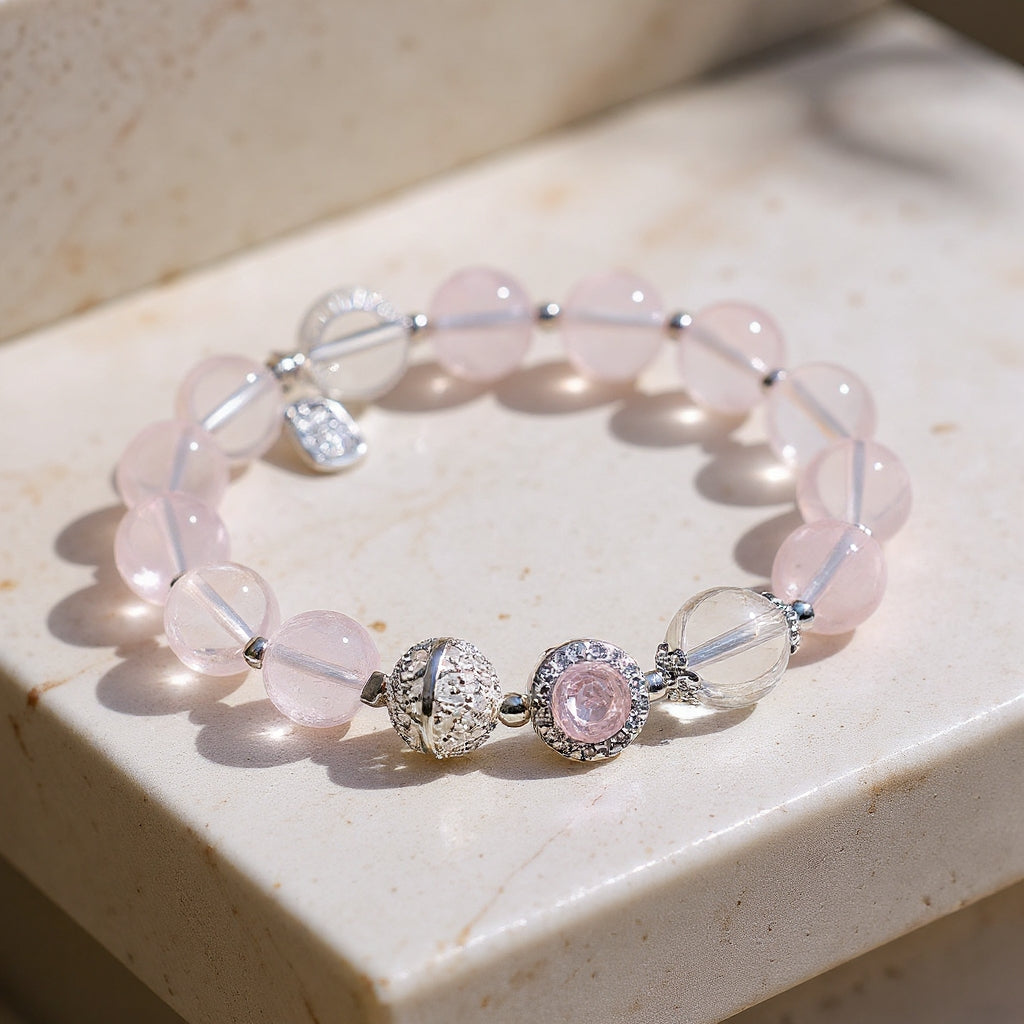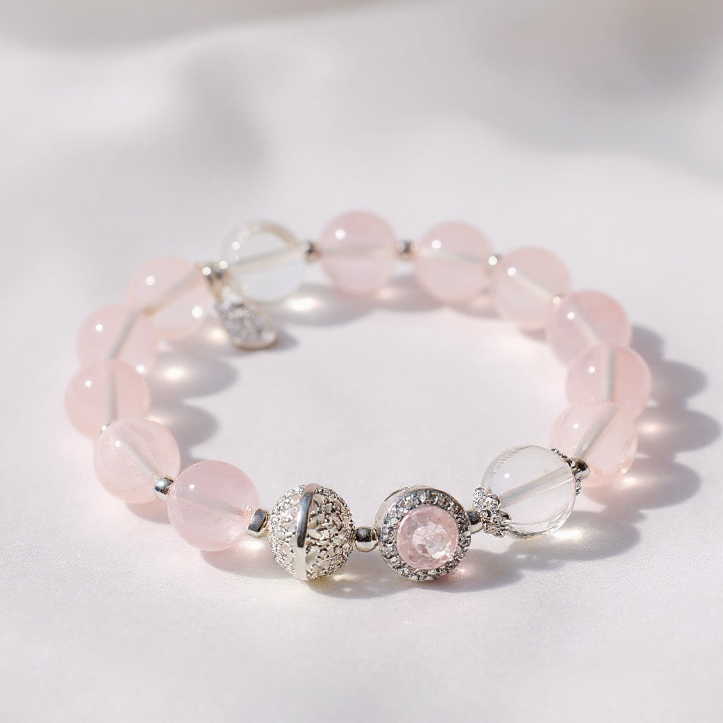 The Rose Quartz Charm Bracelet is a delicate and enchanting accessory crafted from natural rose quartz beads, enhanced with detailed silver-toned charms and accents. Known as the stone of love, rose quartz carries a gentle pink glow that symbolizes harmony, affection, and compassion. With its elegant design, this bracelet is perfect for both daily wear and special occasions, adding a touch of romance and timeless beauty to your style.