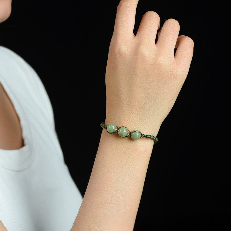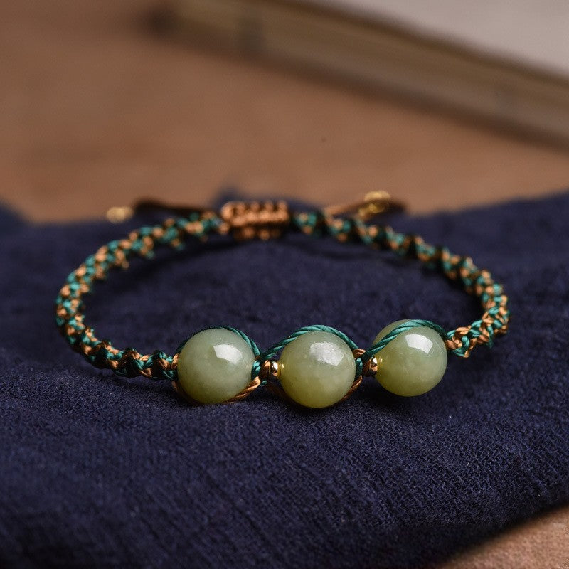 Tibetan Handwoven Triple Green Jade Bead Luck Bracelet