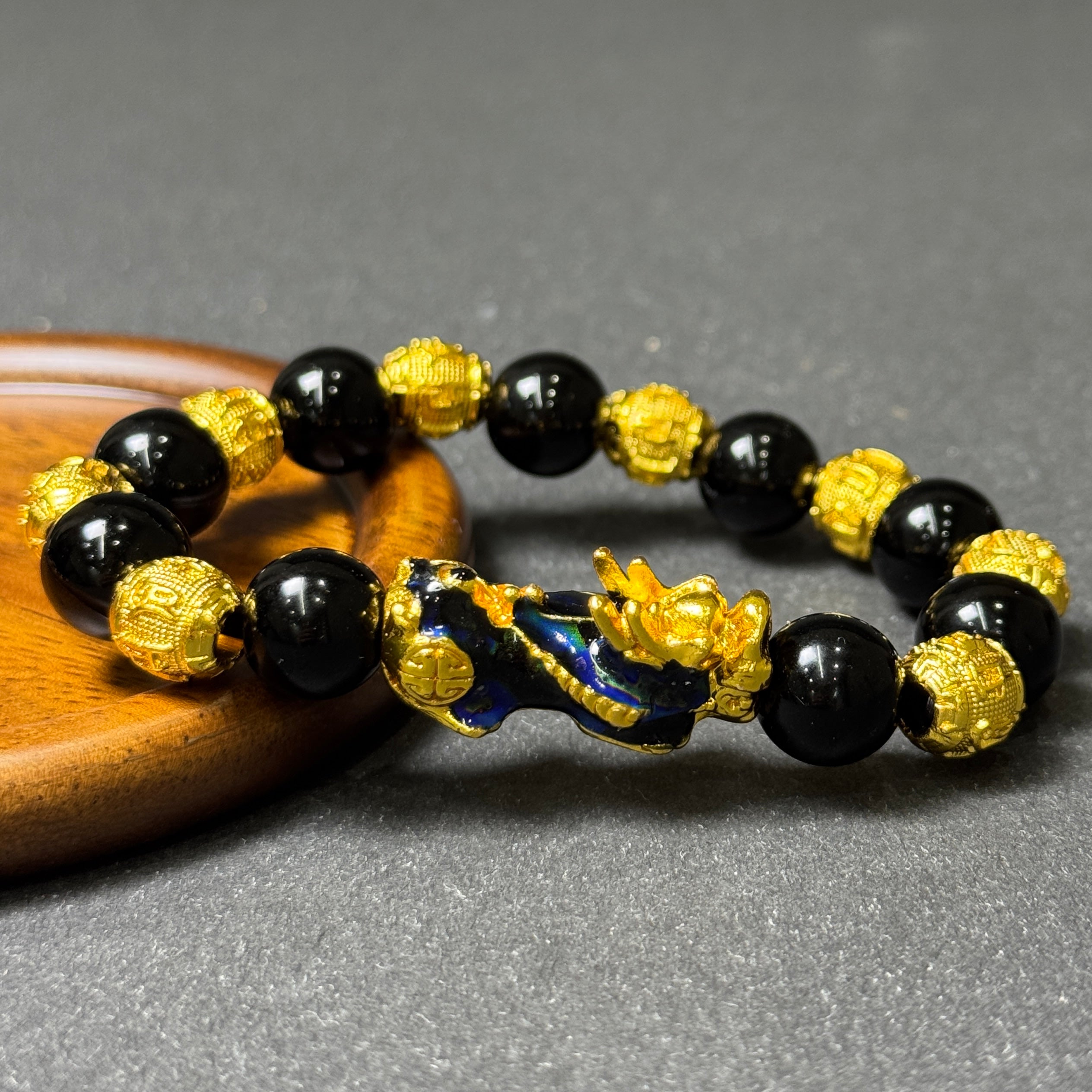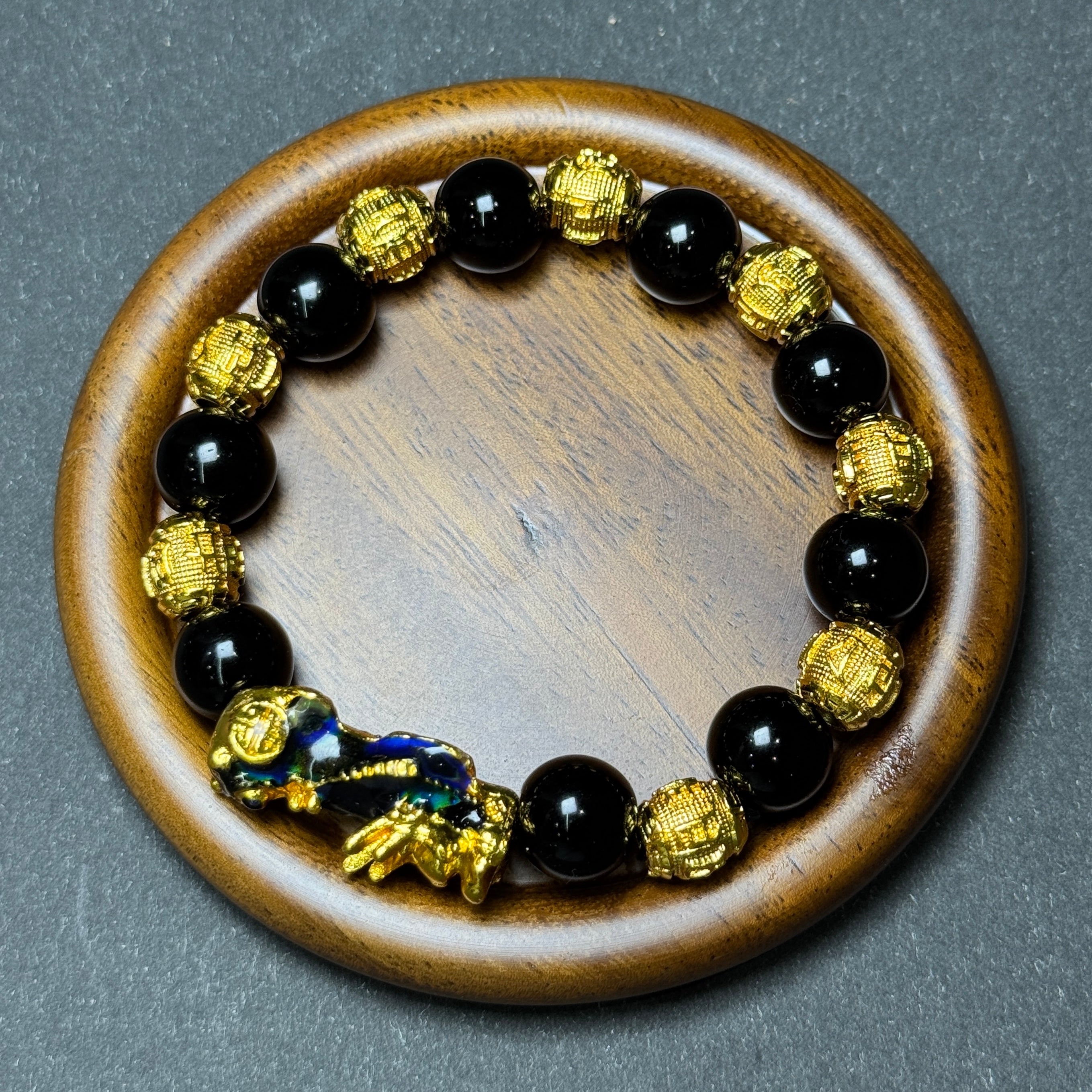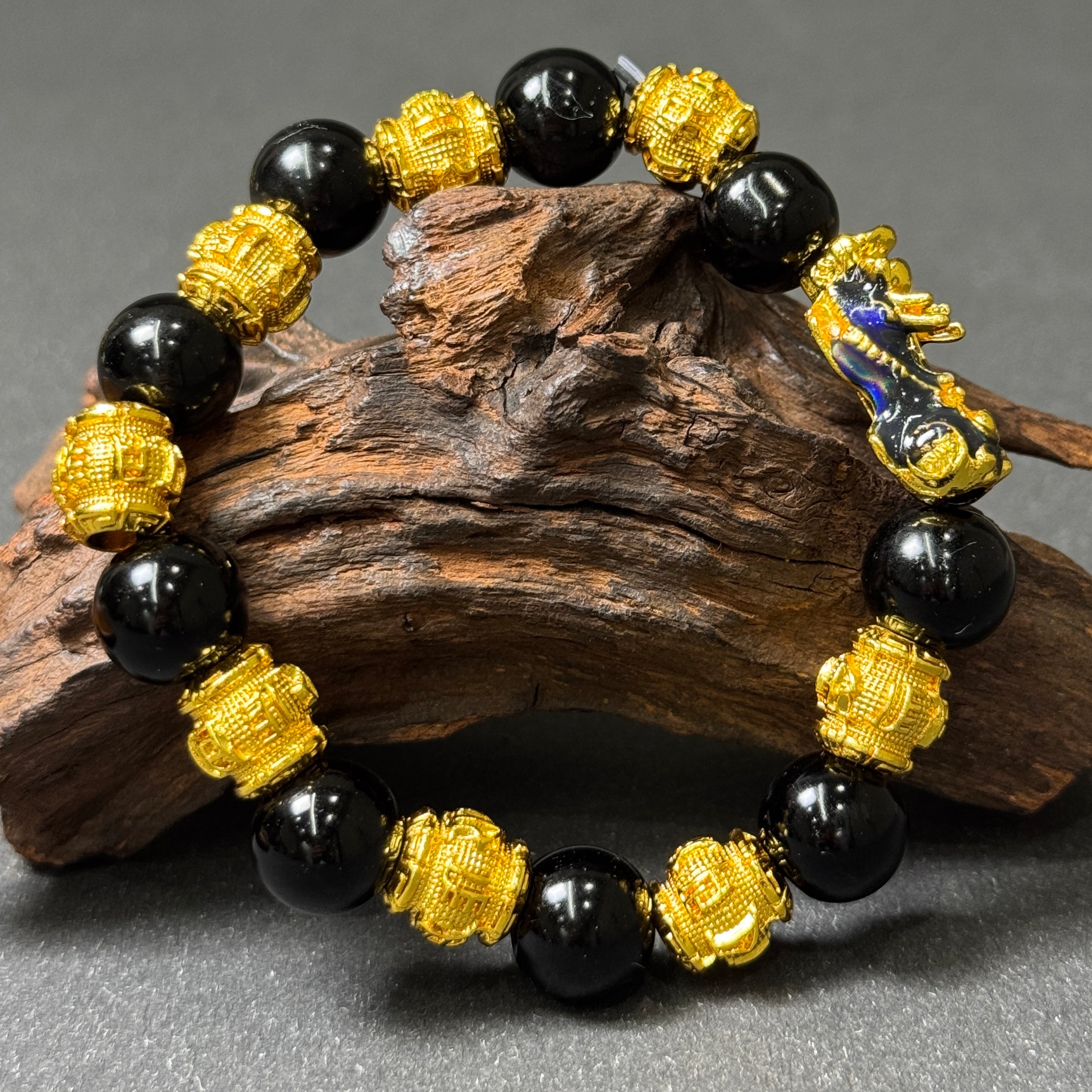 This bracelet blends classic symbolism with a modern energy-conscious design. Crafted with polished black obsidian beads and engraved golden mantra spacers, it features a color-shifting Pixiu centerpiece — a revered symbol of vigilance and wealth in East Asian tradition.