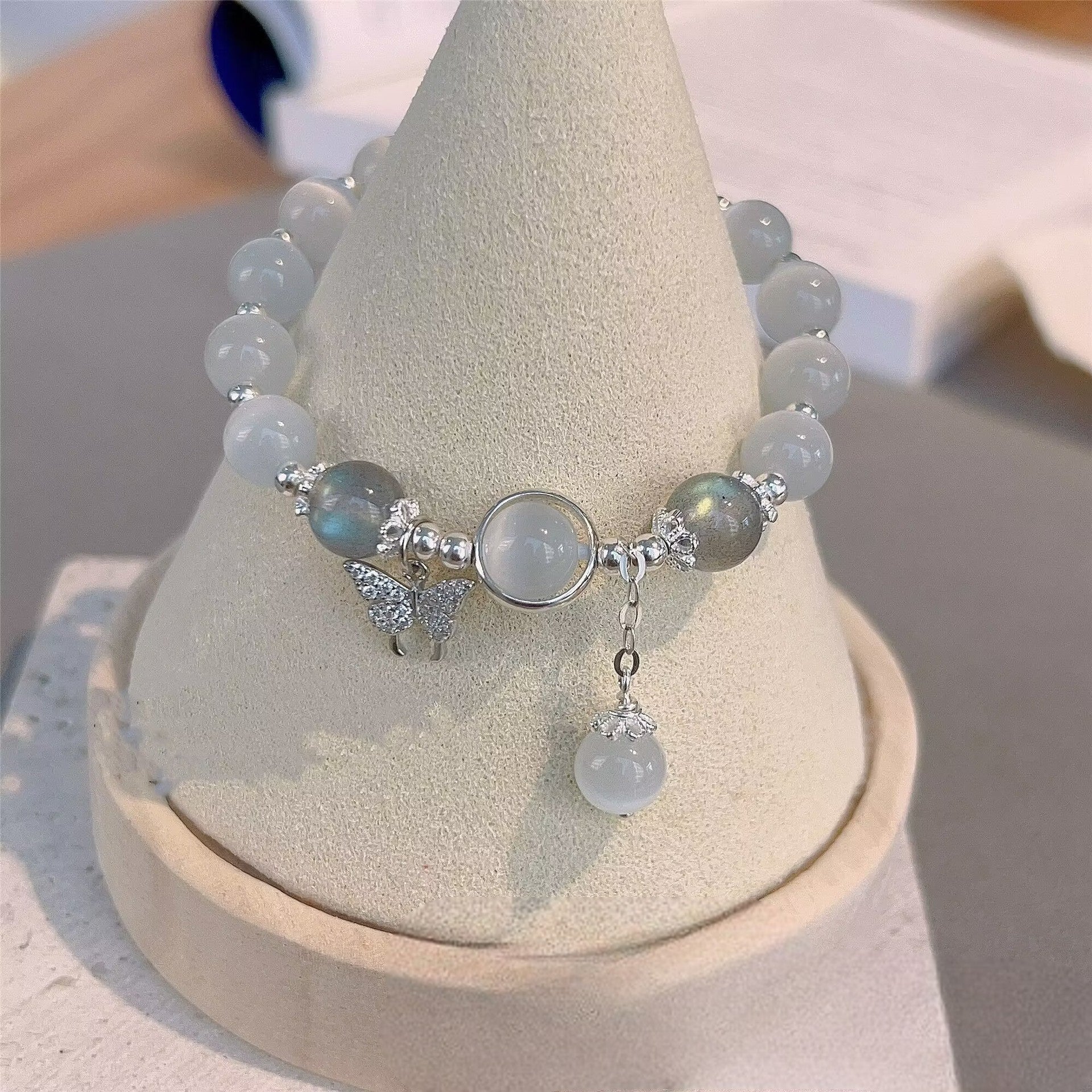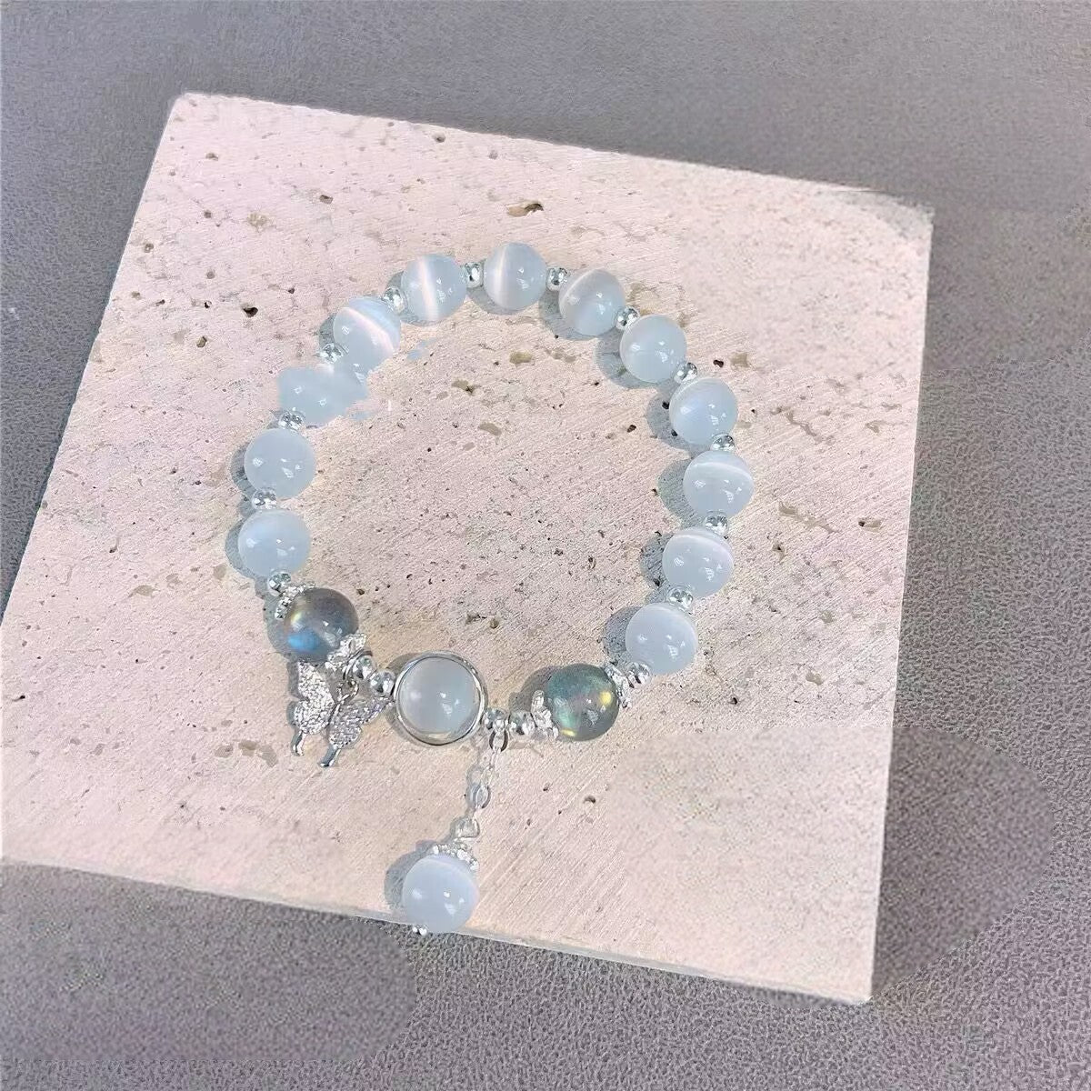 Crafted with grace and luminous beauty, the Butterfly Pendant Moonlight Cat’s Eye Bracelet captures the gentle glow of moonlight and the freedom of a butterfly in flight.