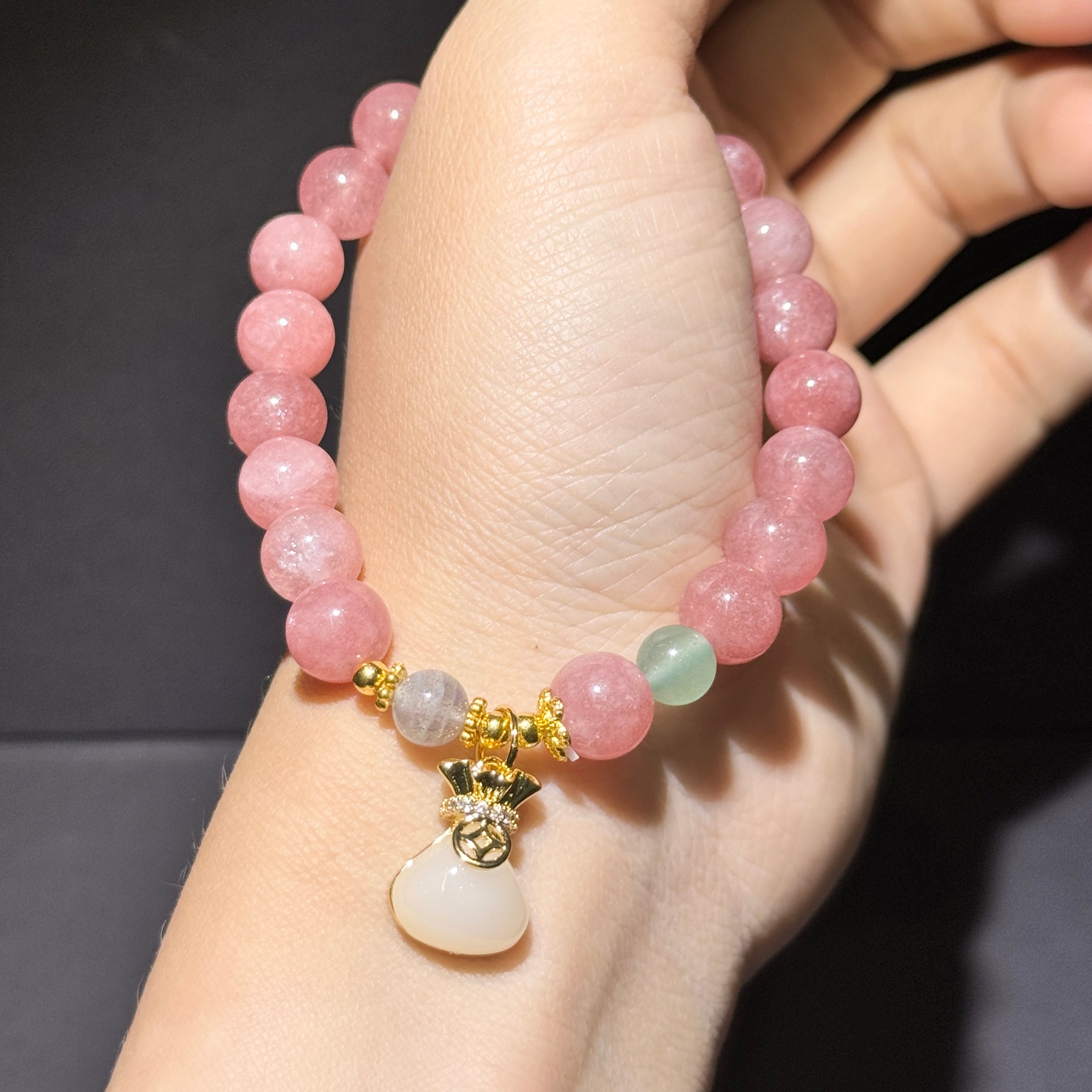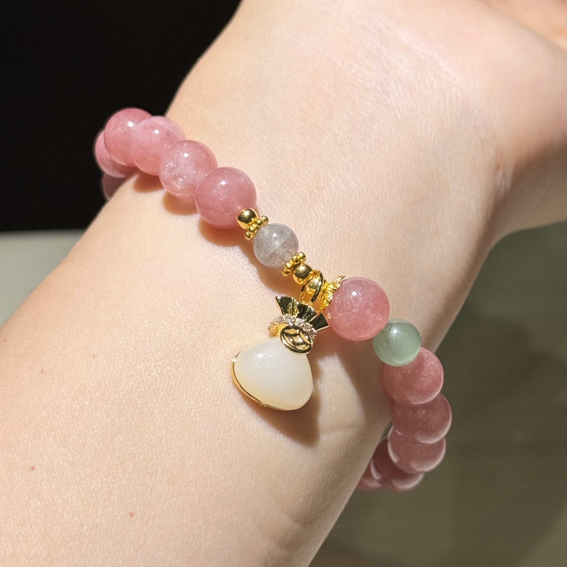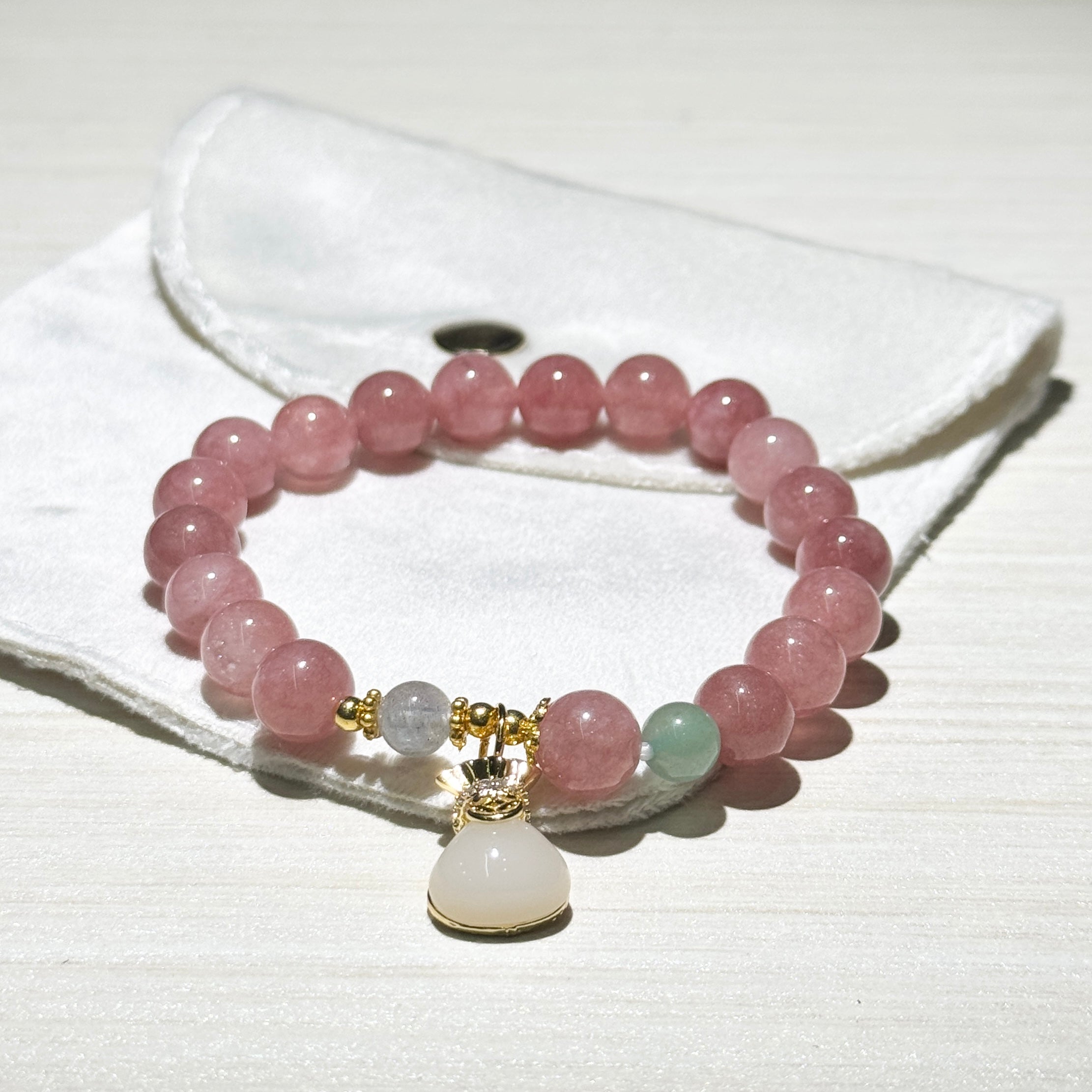 Thoughtfully handcrafted, this bracelet brings together the soft, nurturing energy of strawberry quartz and the timeless calm of jade. Adorned with a symbolic money bag charm, it’s designed to serve as a reminder of your goals—both material and emotional.