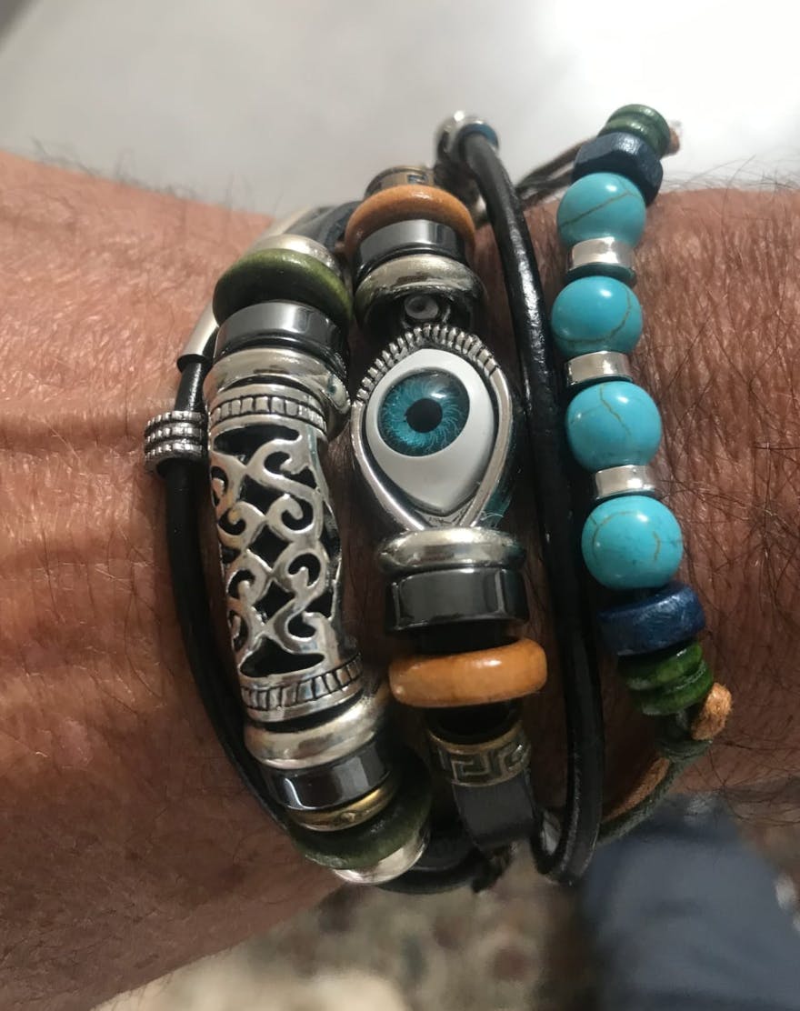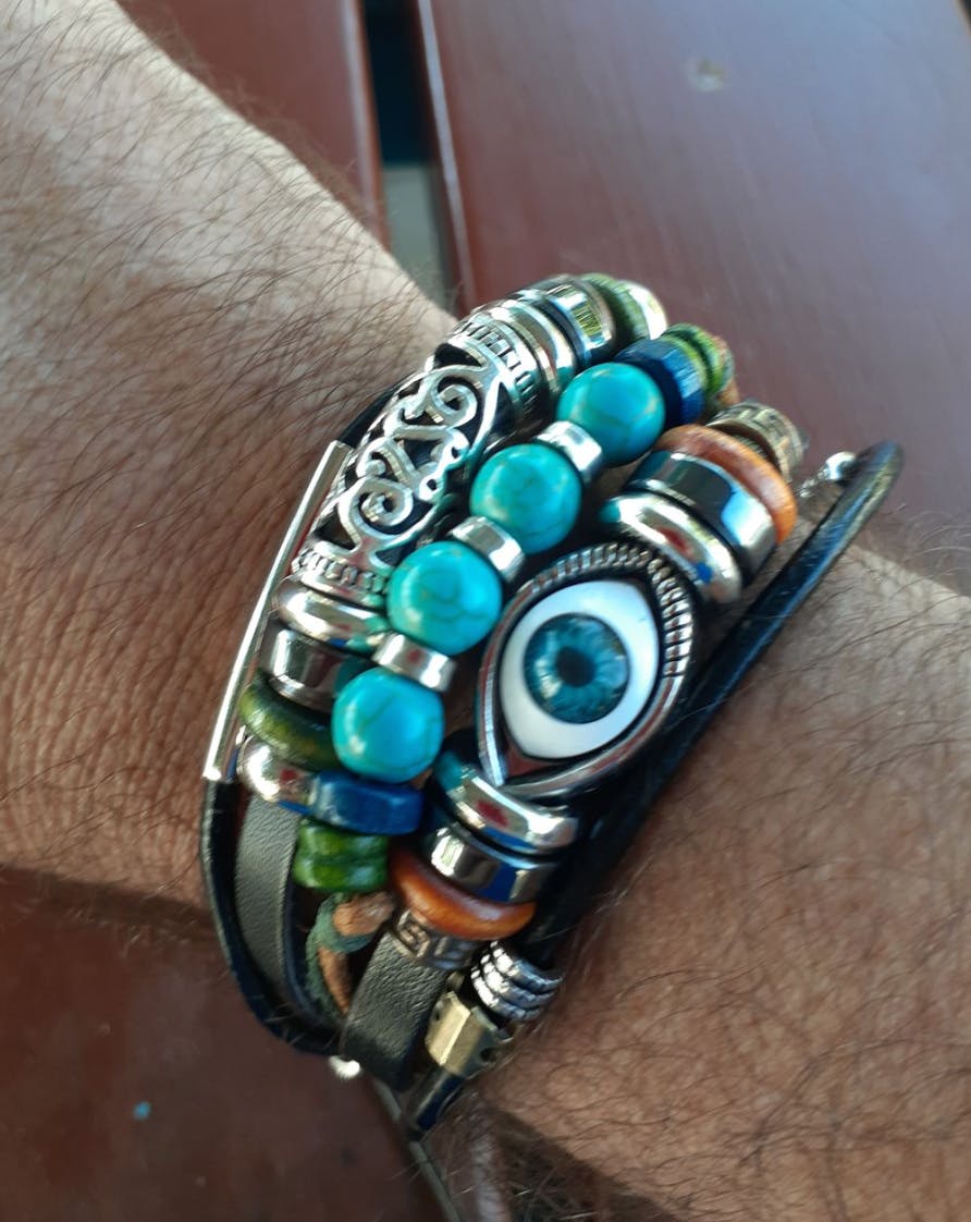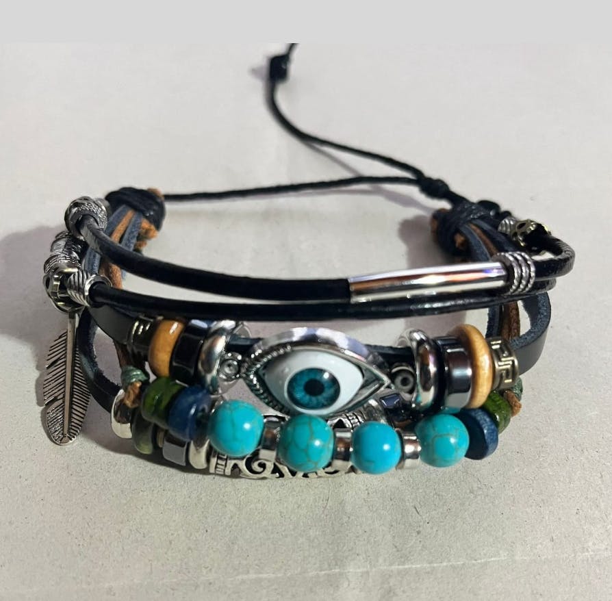 The evil eye charm is a timeless symbol believed to ward off negative energy, jealousy, and harmful intentions, keeping your aura clear and balanced. Turquoise beads, revered for their calming and protective properties, enhance emotional balance, inner peace, and personal strength. The leather band adds durability, flexibility, and a natural, earthy aesthetic.
