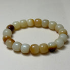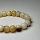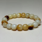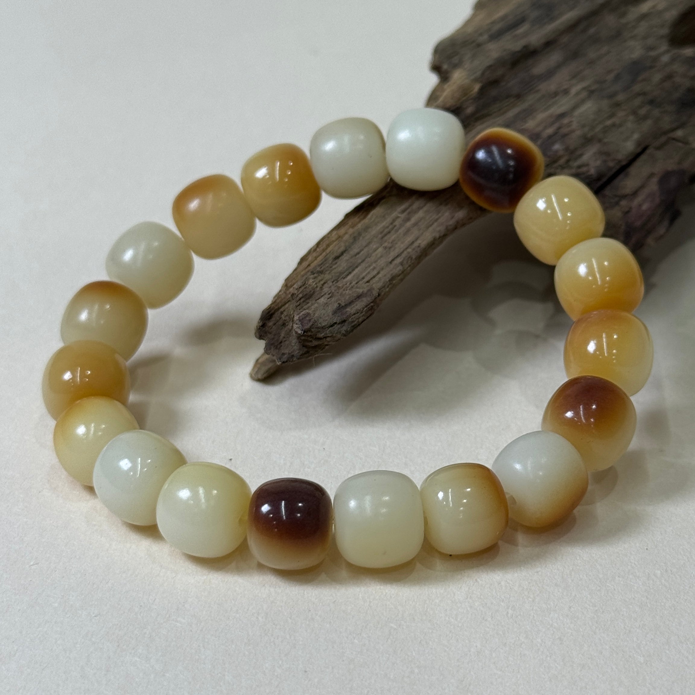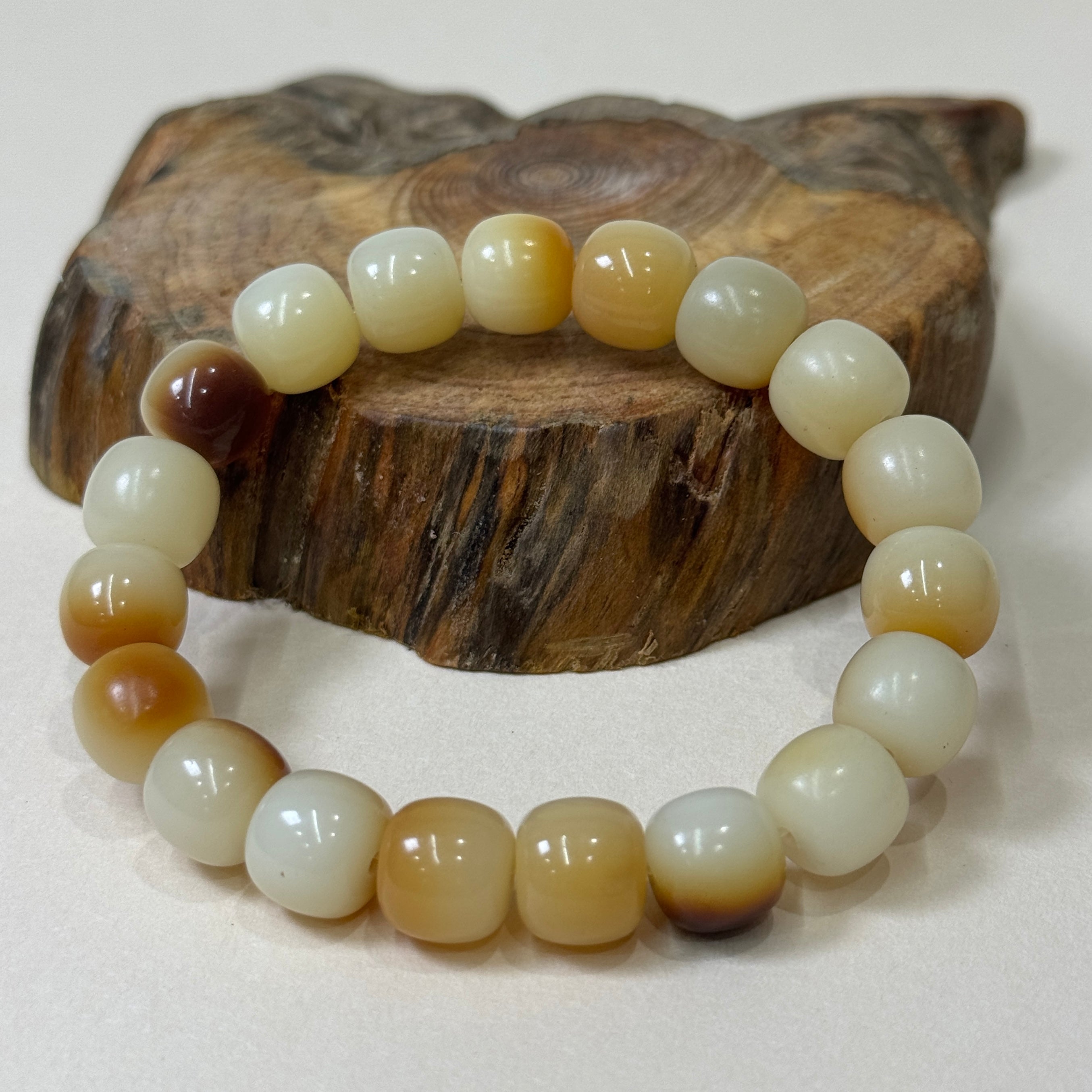 This handcrafted bracelet is made from natural two-tone bodhi Bead, each bead displaying a warm blend of ivory white and amber-brown shades. The Bodhi seed, deeply symbolic in Buddhist tradition, represents enlightenment, mindfulness, and spiritual growth.