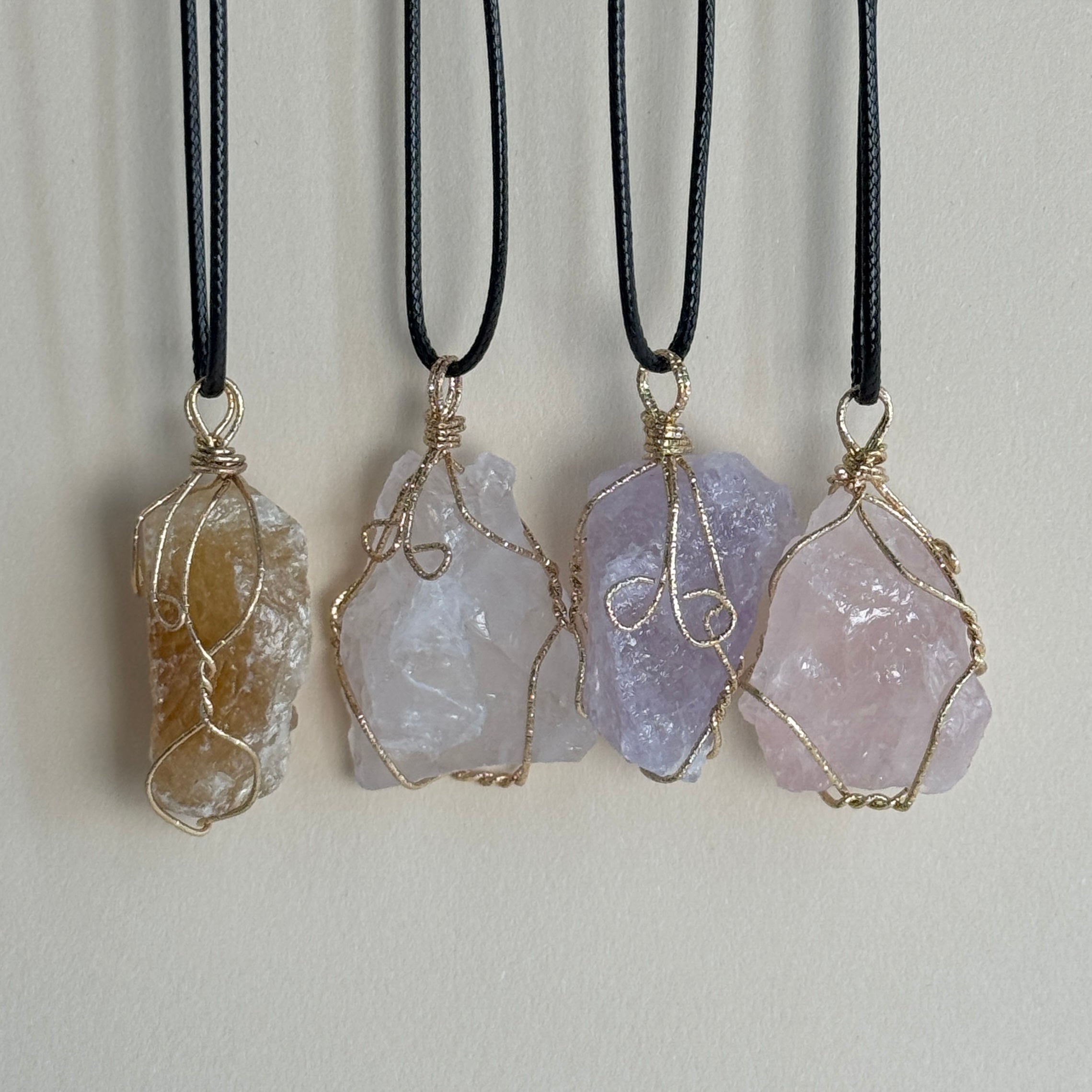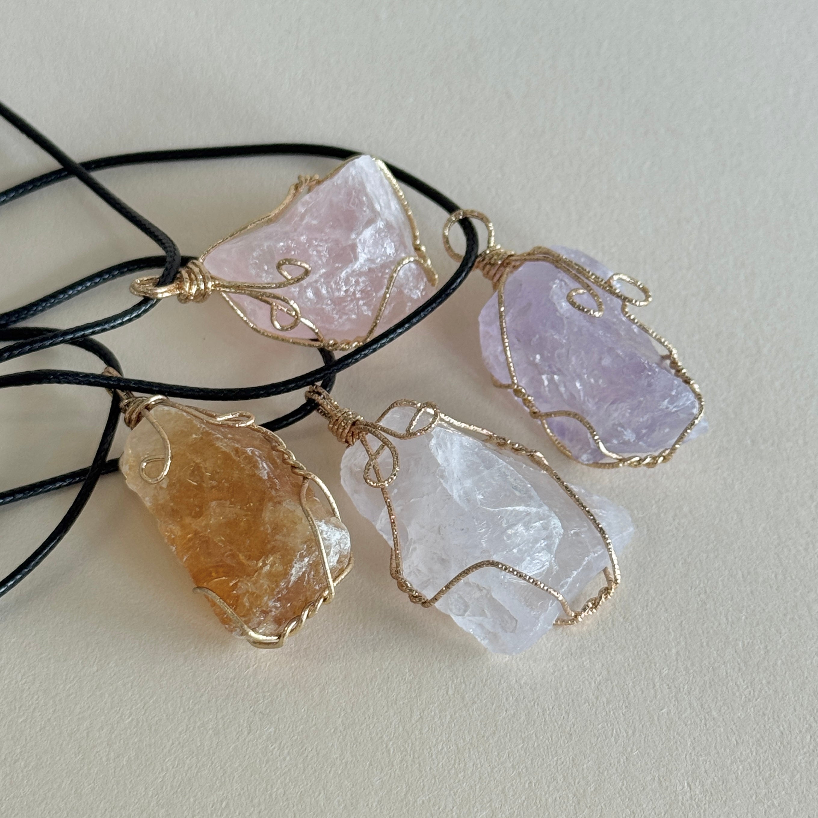 The Raw Crystal Wire-Wrapped Pendant Necklace captures the pure power of nature in its most authentic form. Natural Raw Crystals: Each pendant is made from unpolished crystals (Citrine, Clear Quartz, Amethyst, Rose Quartz), carrying unique energies — abundance, clarity, wisdom, and love. Handcrafted Wire Wrapping: Golden wire wrapping enhances the raw beauty of each stone, creating a one-of-a-kind wearable talisman. Adjustable Cord Necklace: Comfortable and versatile, perfect for everyday wear or meditation.