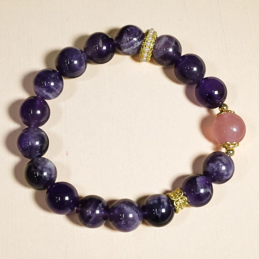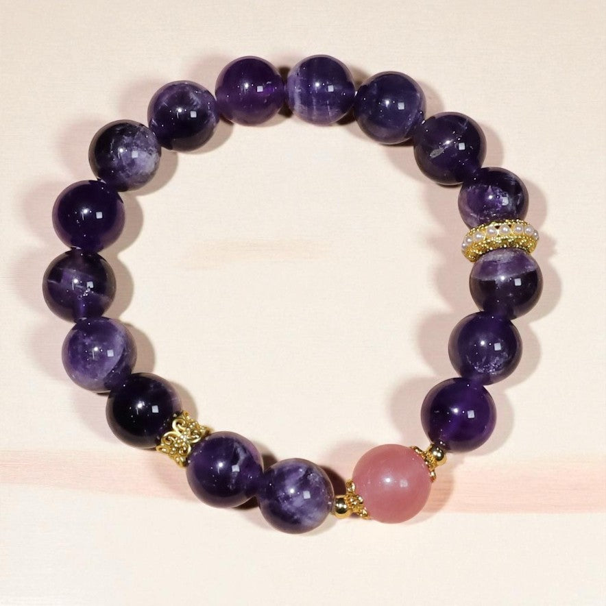 The combination of Amethyst and Strawberry Quartz is believed to create a powerful synergy of calmness and love. Handcrafted with care, this bracelet is designed to help align your mind, heart, and spirit, inviting serenity and joy into your life.